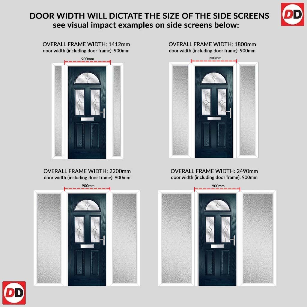 The chosen door width will dictate the side screens size, please see the last image for examples. We may have to contact you to alter your door width to suit the overall frame size.