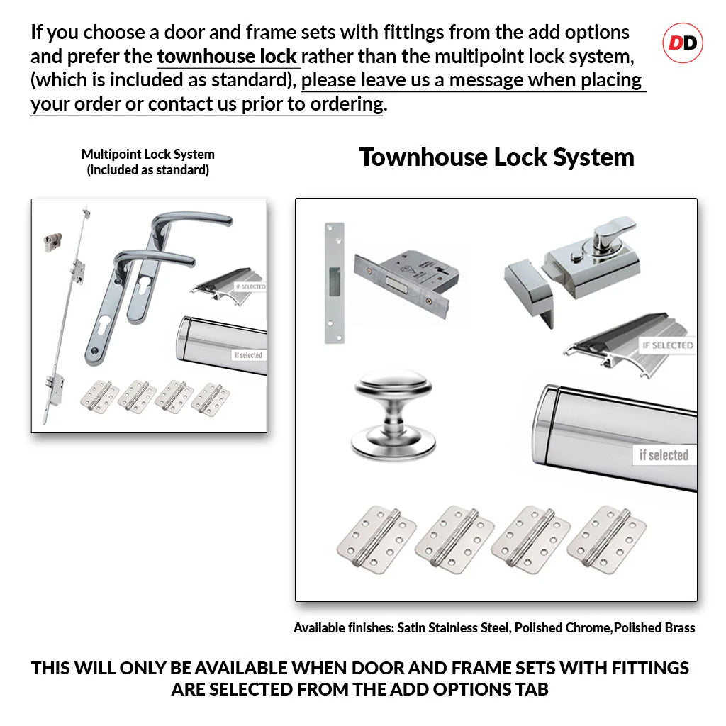 - There is no lock included with the doors. If the doors are purchased with the Door Frame Set with Fittings (from the Add-on section), the lock keepers and plates will be supplied in mill (silver) finish, regardless of the finish applied to the handle and hinges.