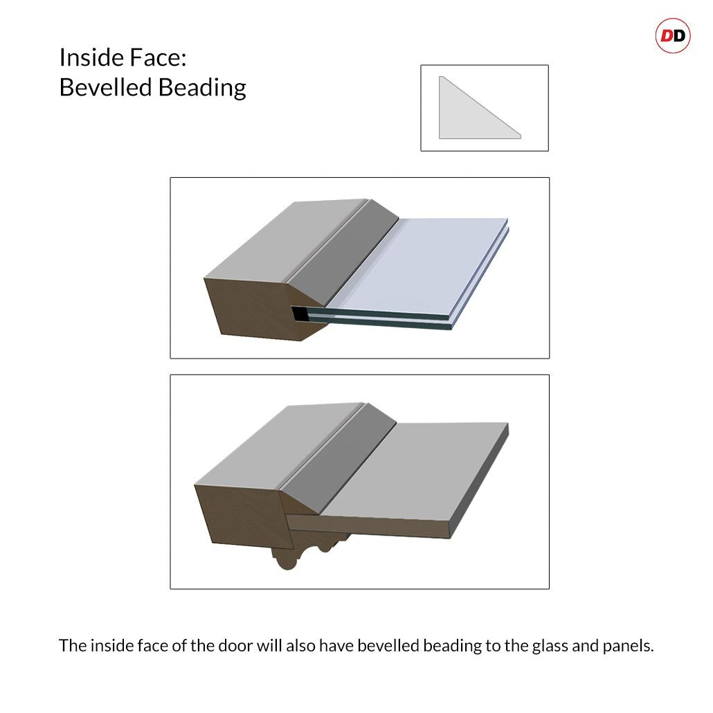 All glass profiles and beadings possess bevelled edges both inside and outside. The external panels will have projected mouldings, while the interior panel profile will showcase a bevelled design.