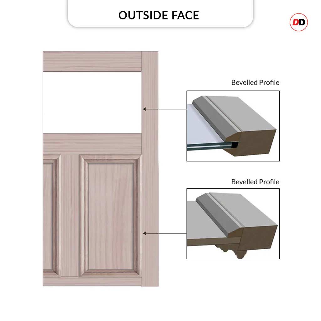 All glass profiles and beadings possess bevelled edges both inside and outside. The external panels will have projected mouldings, while the interior panel profile will showcase a bevelled design.