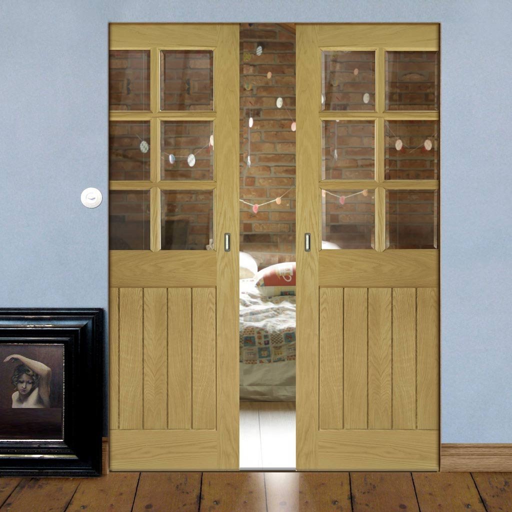 Ely Oak Absolute Evokit Double Pocket Doors - Clear Bevelled Glass - Prefinished