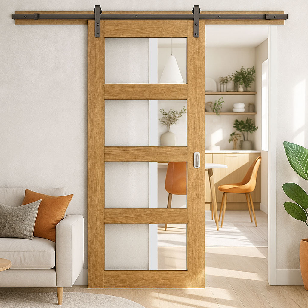 Single Sliding Door & Black Barn Track - Coventry Oak Prefinished Shaker Style Door - Clear Safety Glass
