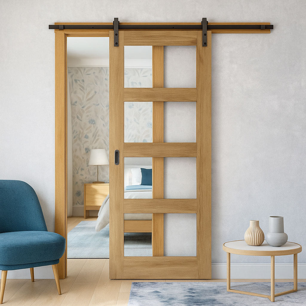 Single Sliding Door & Black Barn Track - Coventry Oak Unfinished Shaker Style Door - Clear Safety Glass