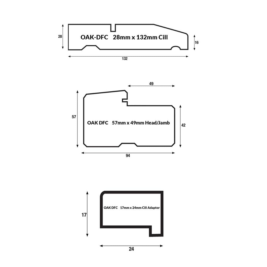 The frame is sold without decoration to suit standard size doors and the cross sections are representative but some dimensions may vary without impacting on the fitting procedure, cill adapters (smallest section) are for opening the door outwards.