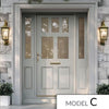 | Glazing | The door is fitted with 28 mm double glazing. If any sidelights or transoms are included, these will feature 14mm double glazing. The door and the sidelights (type B and C) come pre-glazed, while the full pane sidelights (A) will be supplied with loose glass for fitting during installation. |