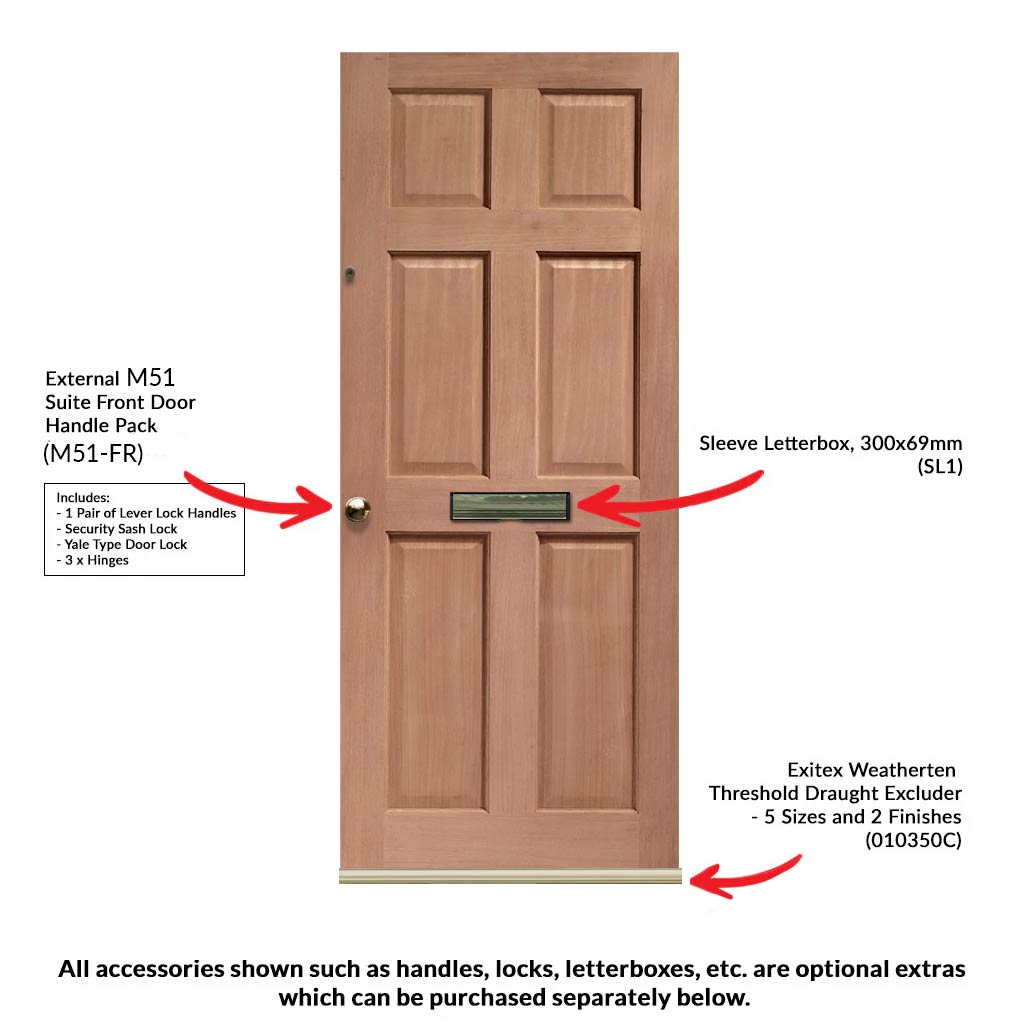 The Colonial Exterior 6 Panel Meranti Hardwood Wooden Door is a stunning addition to any home's exterior. Crafted from premium, high-quality mahogany wood, this door boasts exceptional durability and longevity, while also exuding a classic, timeless elegance.