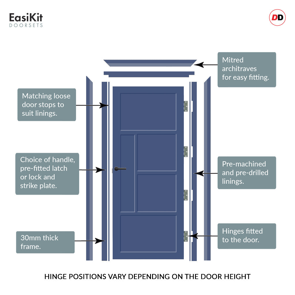 The EasiKit Door Sets provide an easy installation process, utilizing factory-machined hinges and latch or bathroom lock fittings. Choose from a range of high-quality handles and finishes to customize your door set to your personal preference. Packaged in a practical flat pack kit, our set includes a durable, versatile frame and an architrave kit that seamlessly matches all frame sizes.
