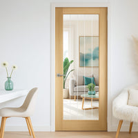 The Cheshire Oak Internal Door - Clear Glass, sleek and stylish oak construction paired with contemporary styling creates the perfect balance between durability and design, making it an investment that enhances your home's aesthetic for years to come.
