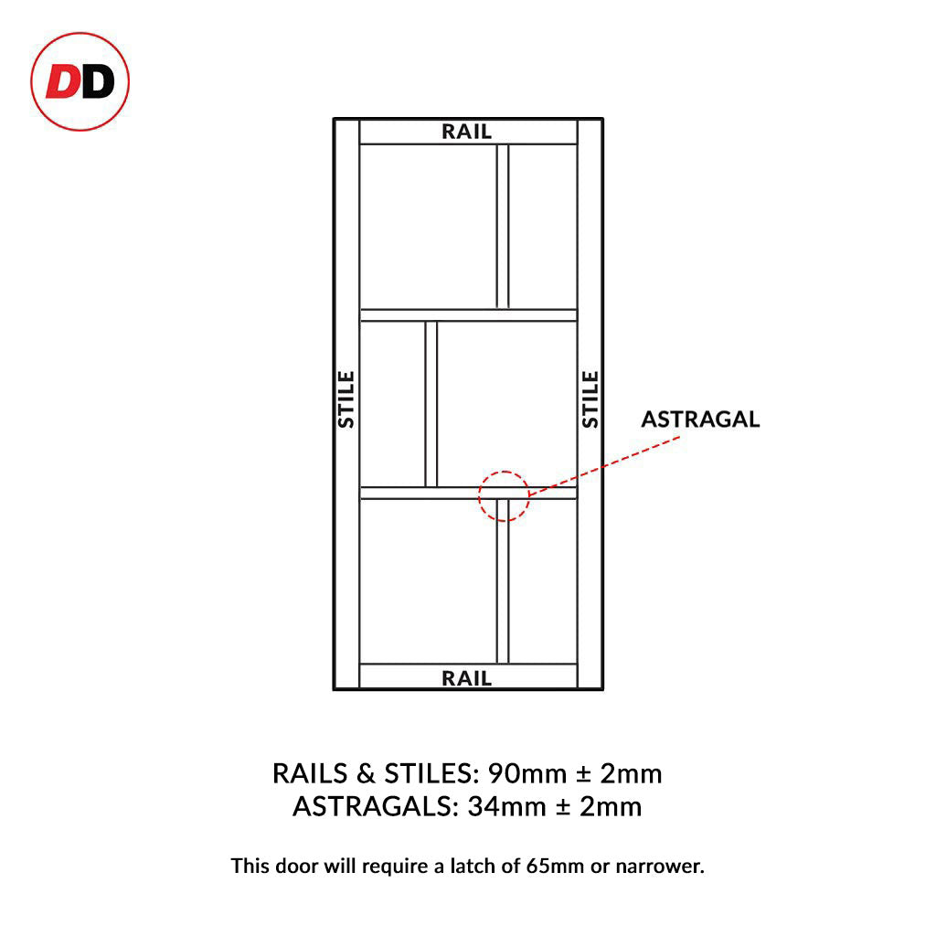 All doors from DirectDoors Bespoke Slimline range are 40-45mm thick, rail & stile breadths are 90mm, astragals are 34x40mm. All dimensions and thicknesses are +/- 2mm.