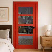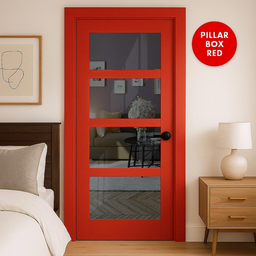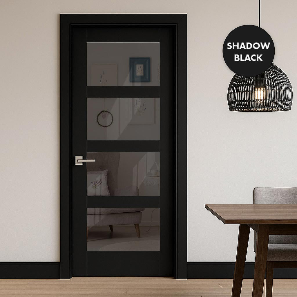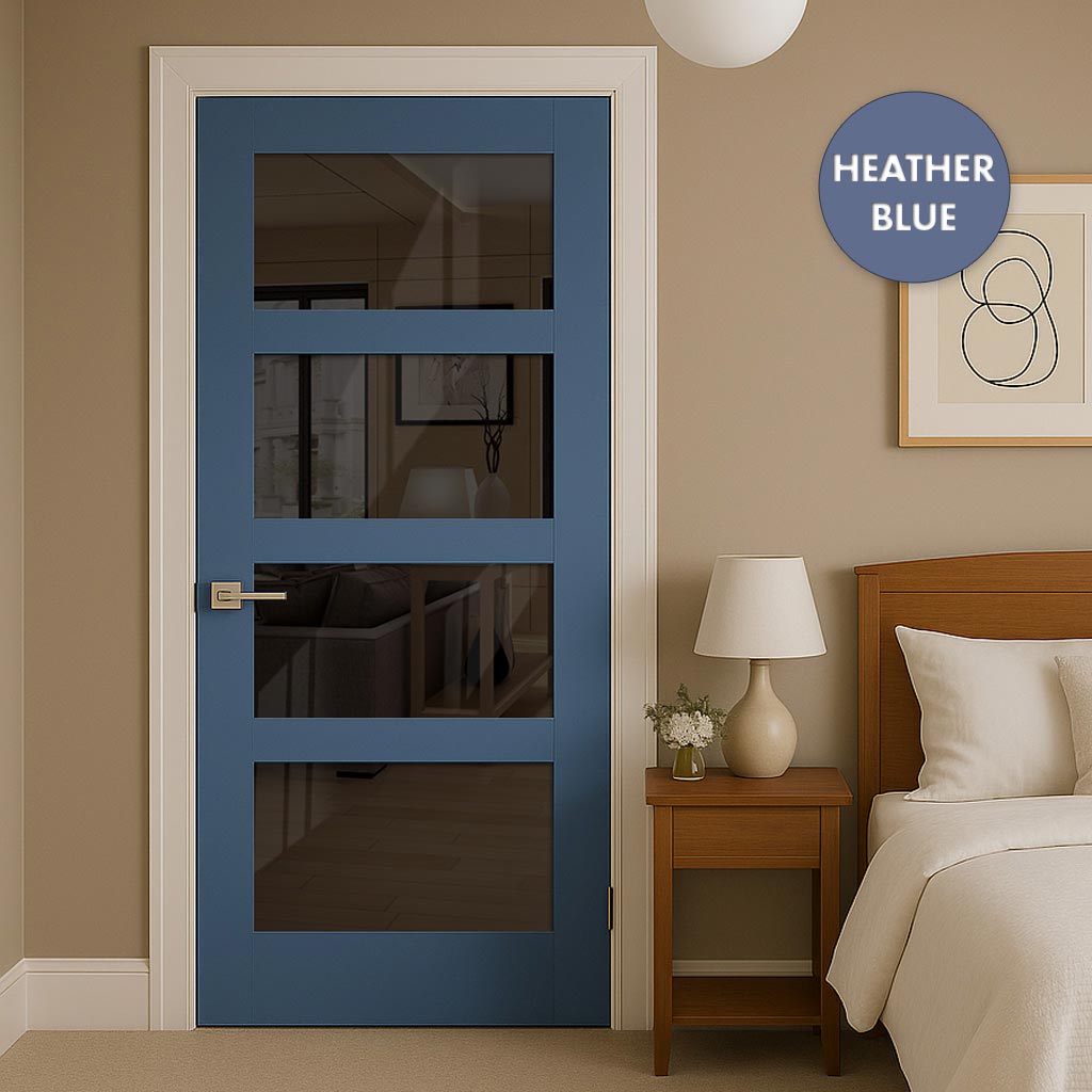 Experience the versatility and sophistication of the Made to Measure UK - Ashford 4L Interior Door, expertly crafted in the UK. Select from 7 colour choices to achieve a custom appearance. This premium offering features tinted glass and square beading on one side, providing a distinctive element.