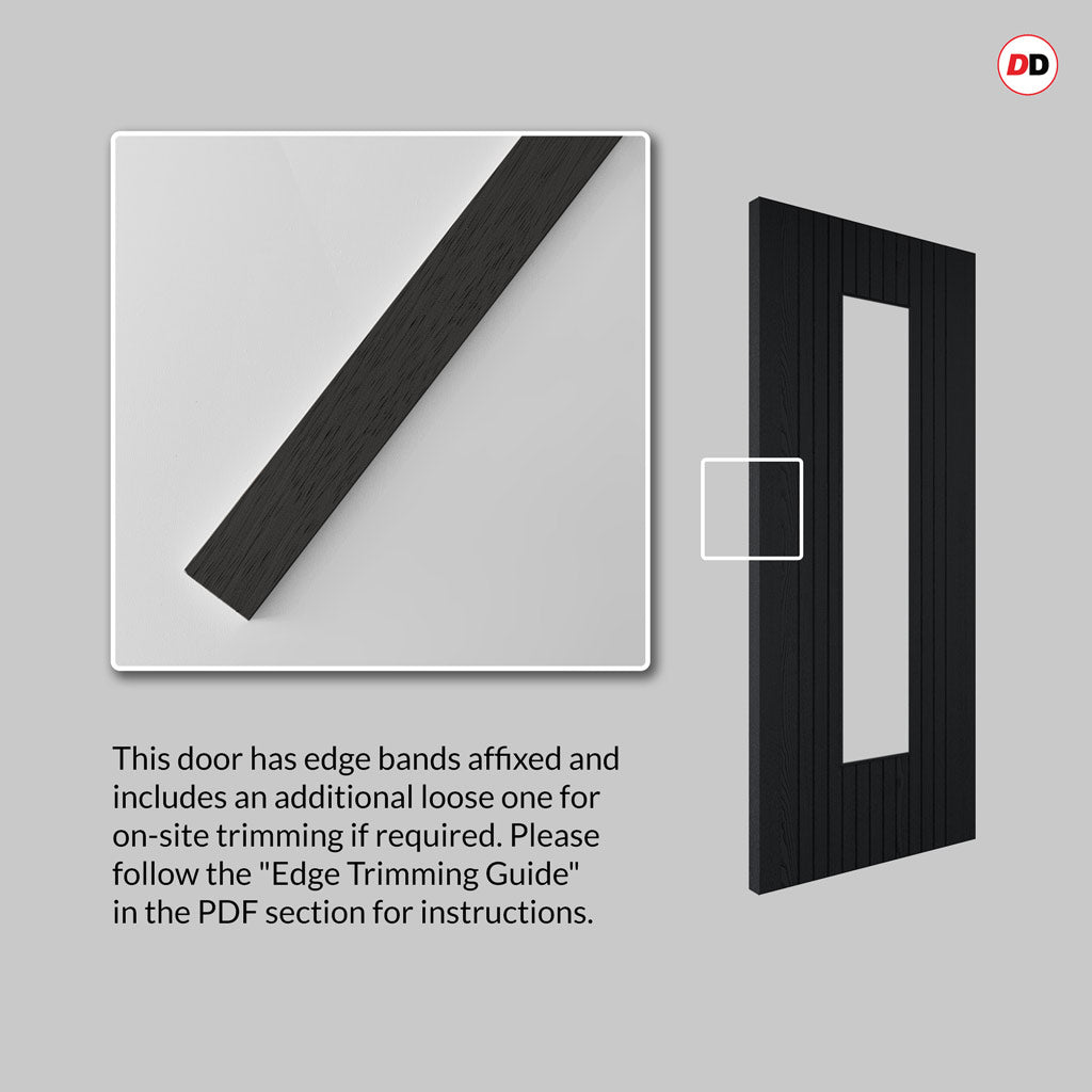- As this door has edge bands already affixed, please see the Edge Trimming Guide in the PDFs section, if there is a need for on-site trimming.