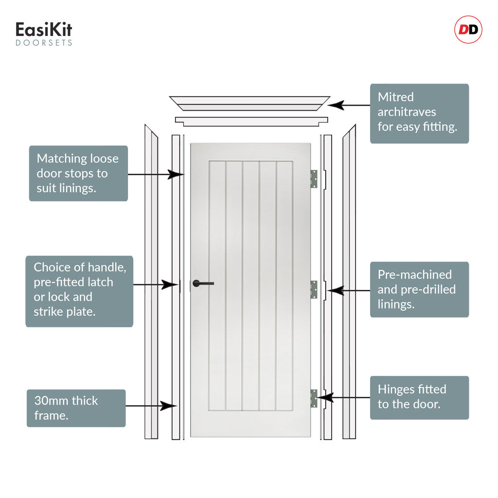 The EasiKit Door Sets provide an easy installation process, utilizing factory-machined hinges and latch or bathroom lock fittings. Choose from a range of high-quality handles and finishes to customize your door set to your personal preference. Packaged in a practical flat pack kit, our set includes a durable, versatile frame and an architrave kit that seamlessly matches all frame sizes.