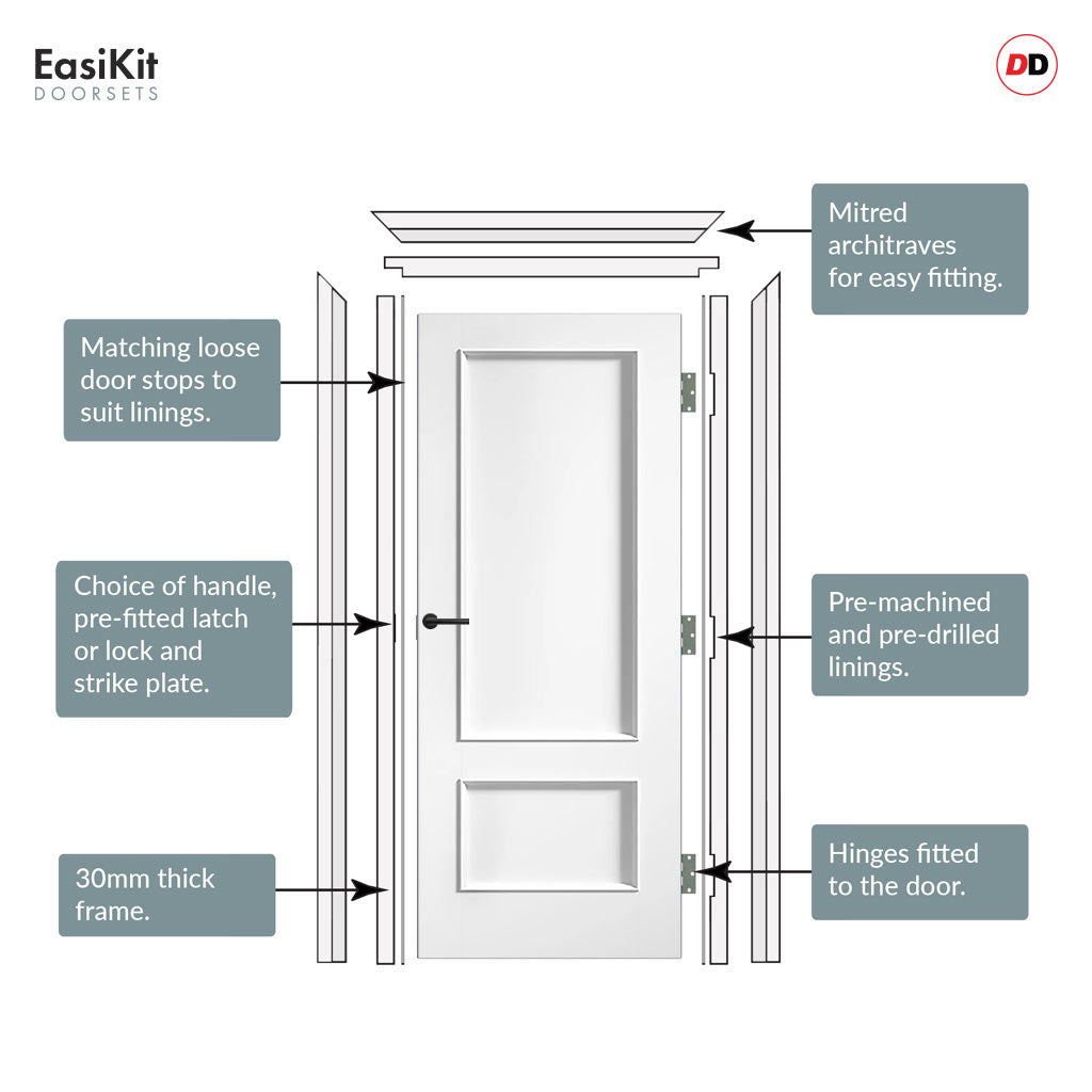 The EasiKit Door Sets provide an easy installation process, utilizing factory-machined hinges and latch or bathroom lock fittings. Choose from a range of high-quality handles and finishes to customize your door set to your personal preference. Packaged in a practical flat pack kit, our set includes a durable, versatile frame and an architrave kit that seamlessly matches all frame sizes.
