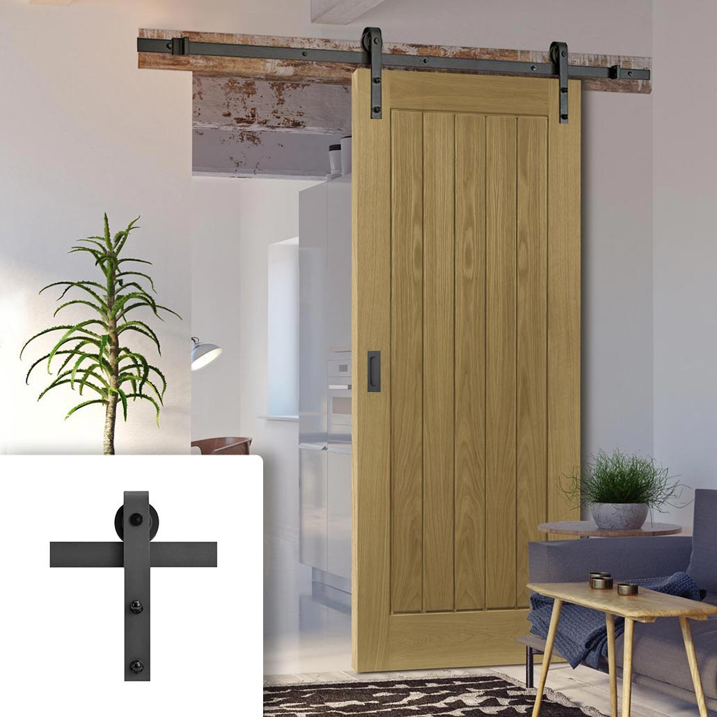 Single Sliding Door & Black Barn Track - Ely Unfinished Oak Door