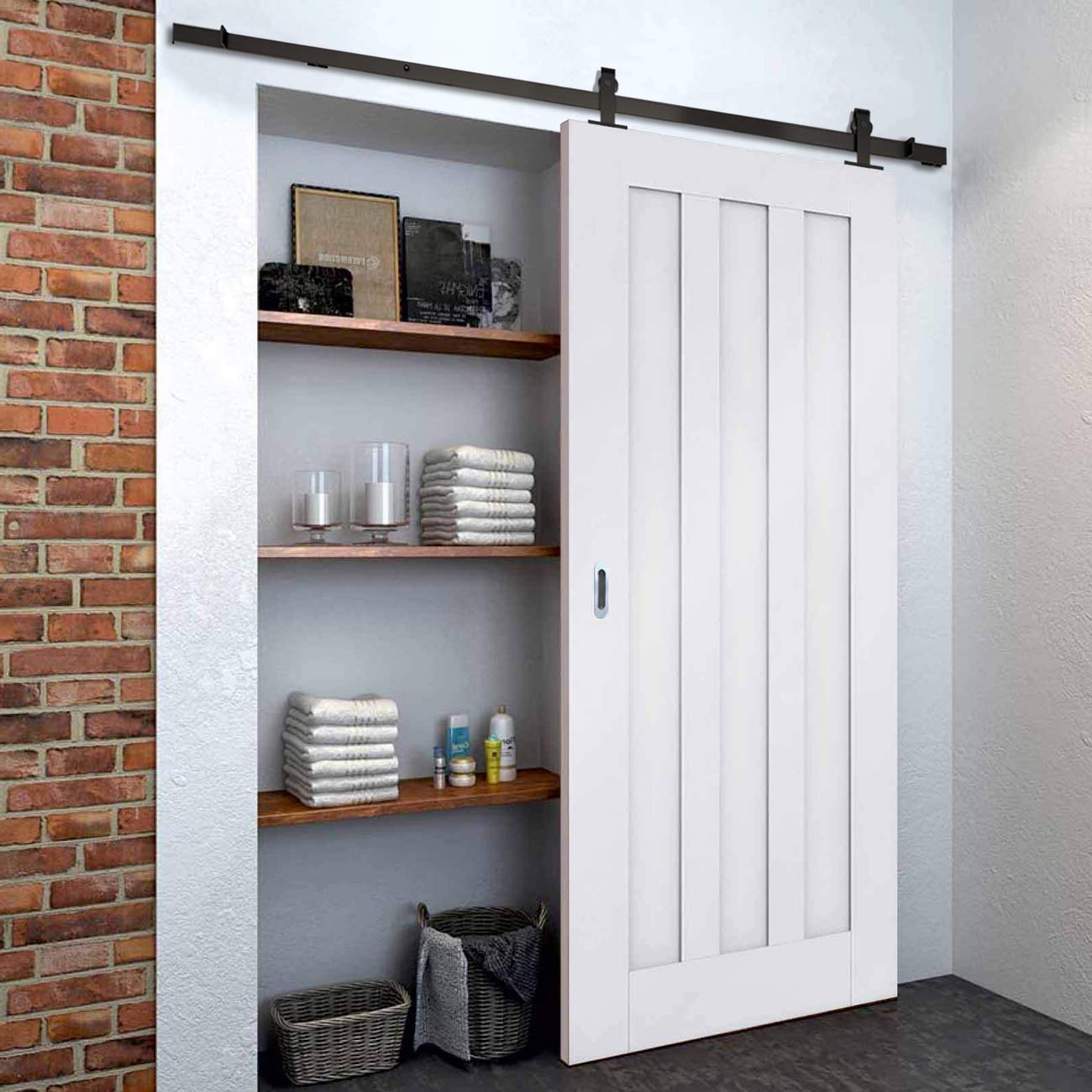 - A high quality top mounted sliding track system finished in black, the top mounted track is screwed directly into the top of the door which gives the whole system a very sleek look. This track is suitable for a maximum weight of 80 kg per door.