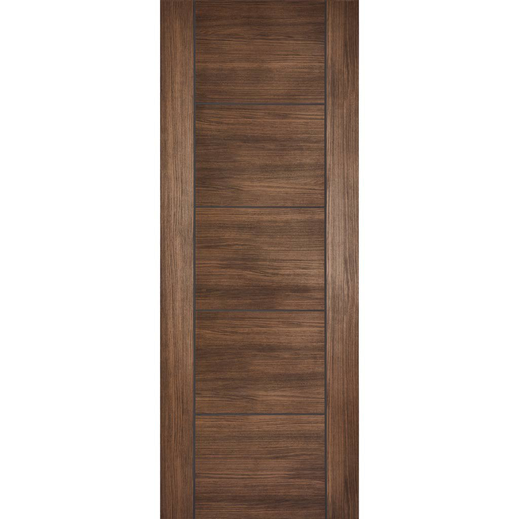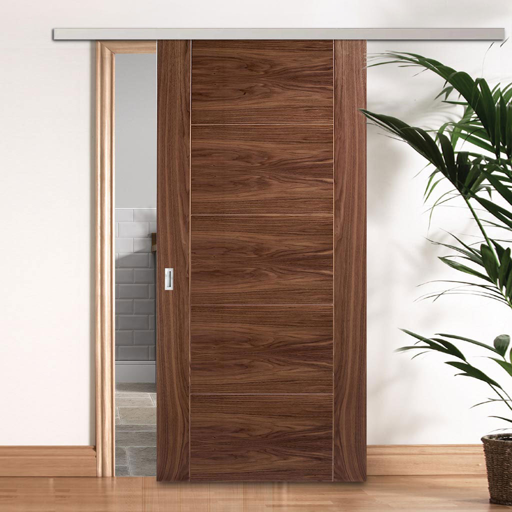 Premium Single Sliding Door & Wall Track - Vancouver 5 Panel Flush Walnut Door - Prefinished