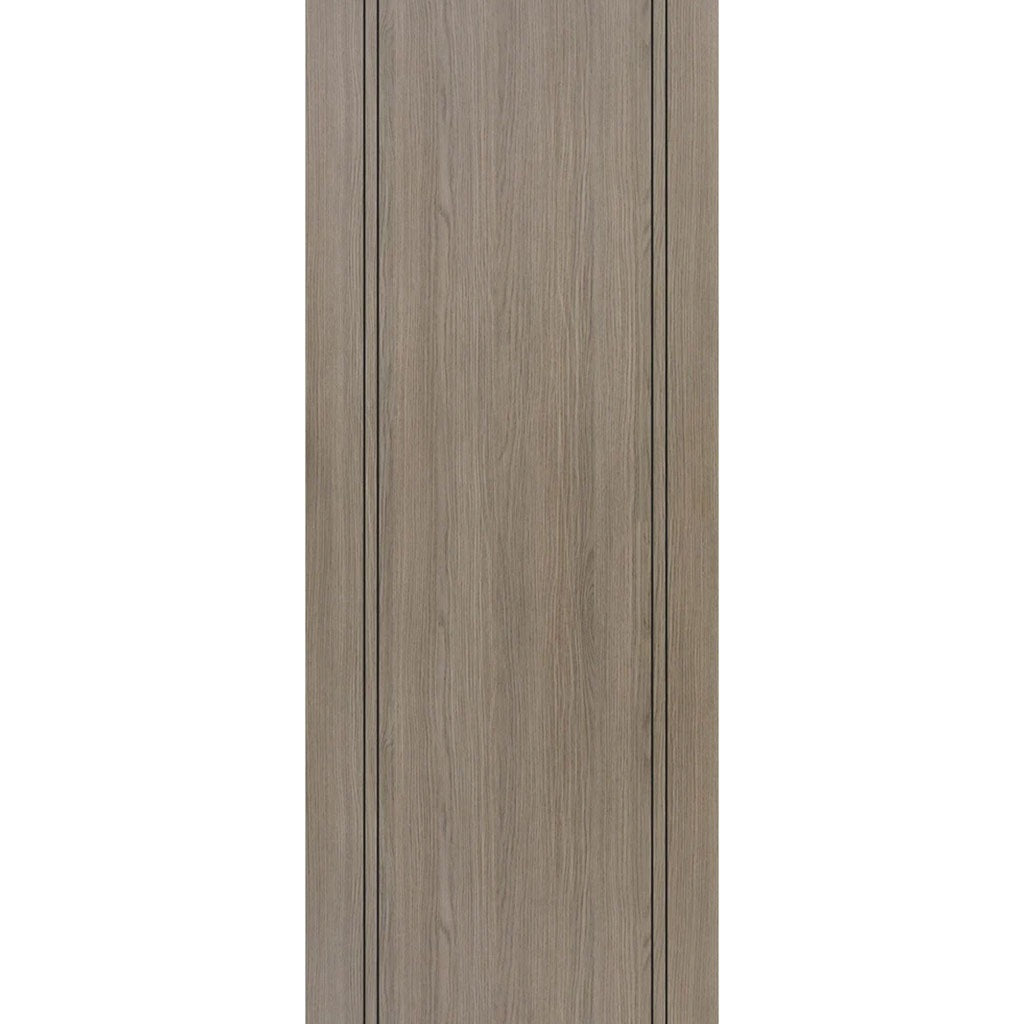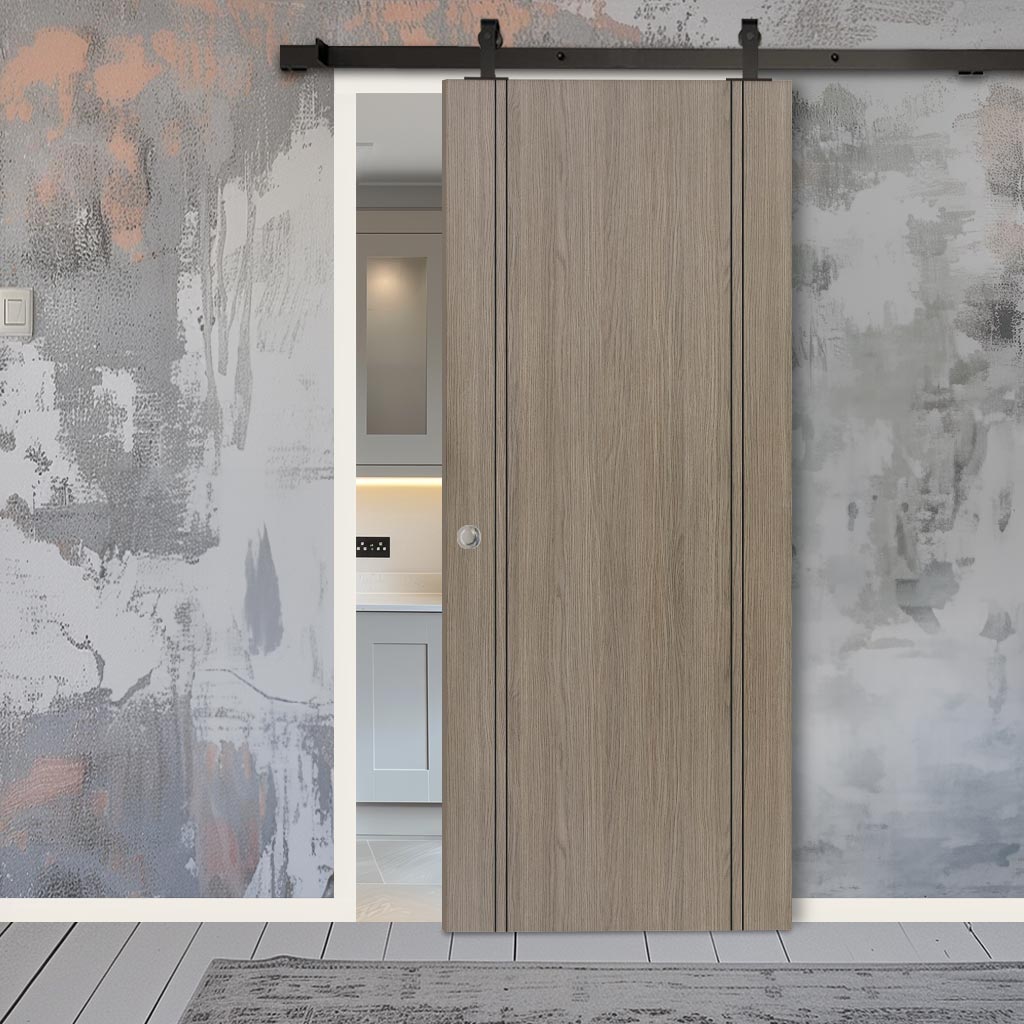 Top Mounted Black Sliding Track & Door - Monaco Flush Light Grey Internal Door with Contrasting Lines - Laminated