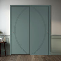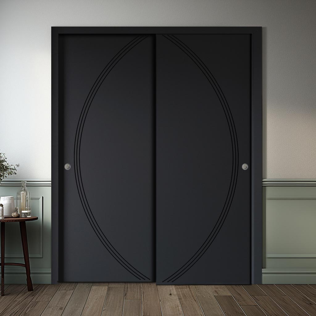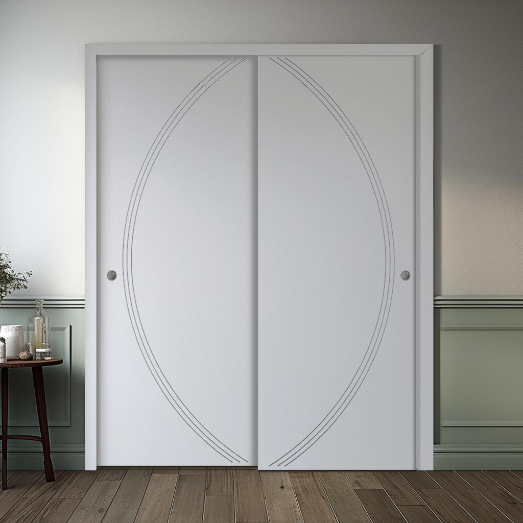 Two Sliding Minimal Wardrobe Doors & Frame Kit - V-Line® Grooved Flush Door V008 - Premium Primed - Six Colour Options