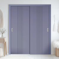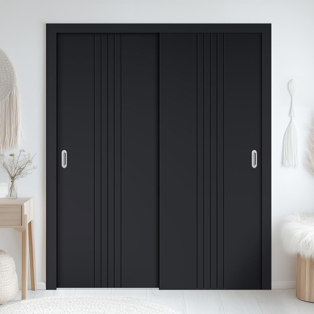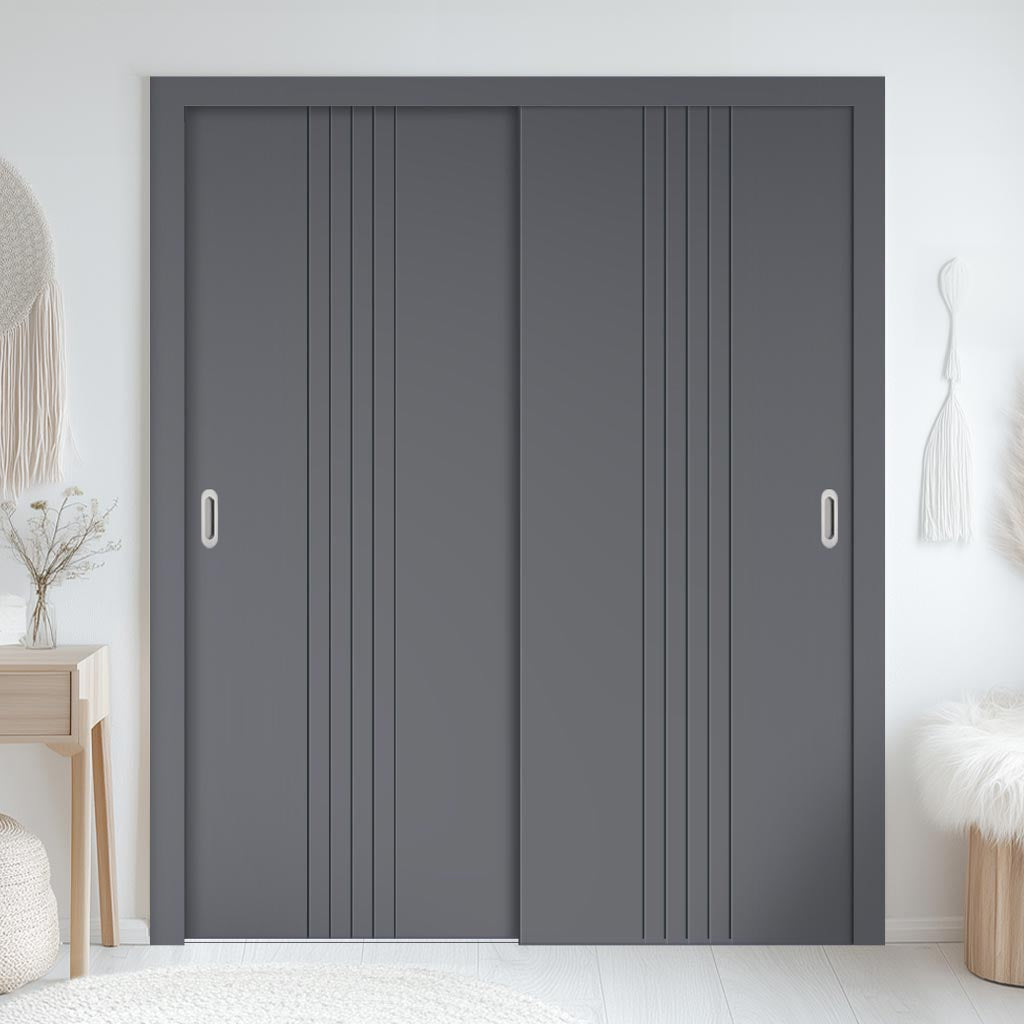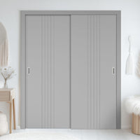 Two Sliding Minimal Wardrobe Doors & Frame Kit - V-Line® Grooved Flush Door V021 - Premium Primed - Six Colour Options