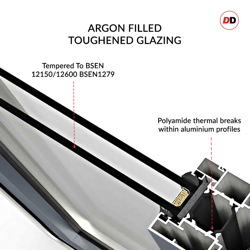 Glazing 28mm Toughened Low E Double Glazed Unit. Argon filled toughened glass tempered to BSEN 12150/12600 BSEN1279. AluVu doors can to obtain a U-Value of 1.2w/m°k. The glazing is delivered loose to facilitate easy offload and installation.