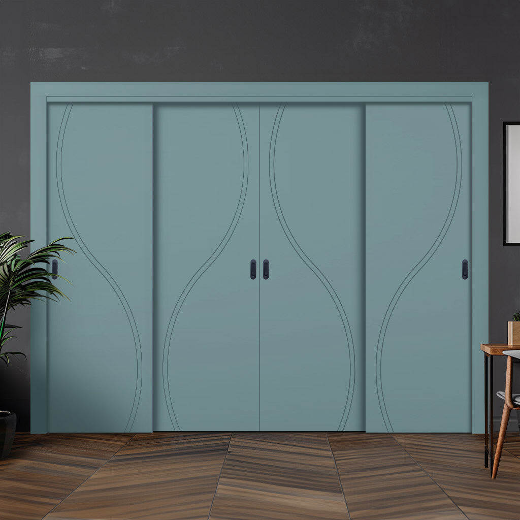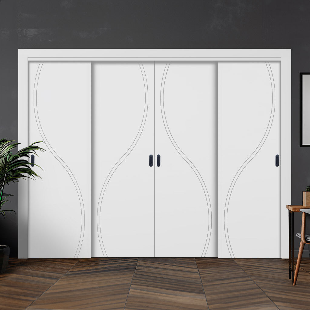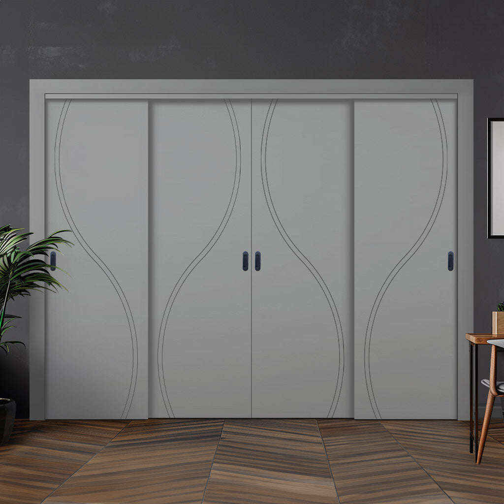 Four Sliding Maximal Wardrobe Doors & Frame Kit - V-Line® Grooved Flush Door V027 - Premium Primed - Six Colour Options