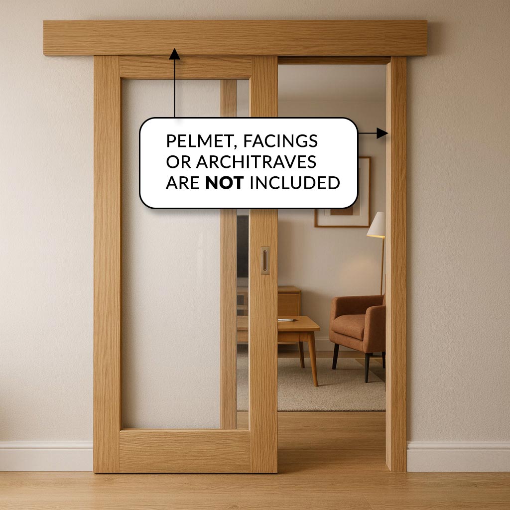 Notes | The size listed above is for the overall door kit which includes the door and track system with face fix brackets but does not include any architrave extension plates to carry the track or any pelmet top and face. |