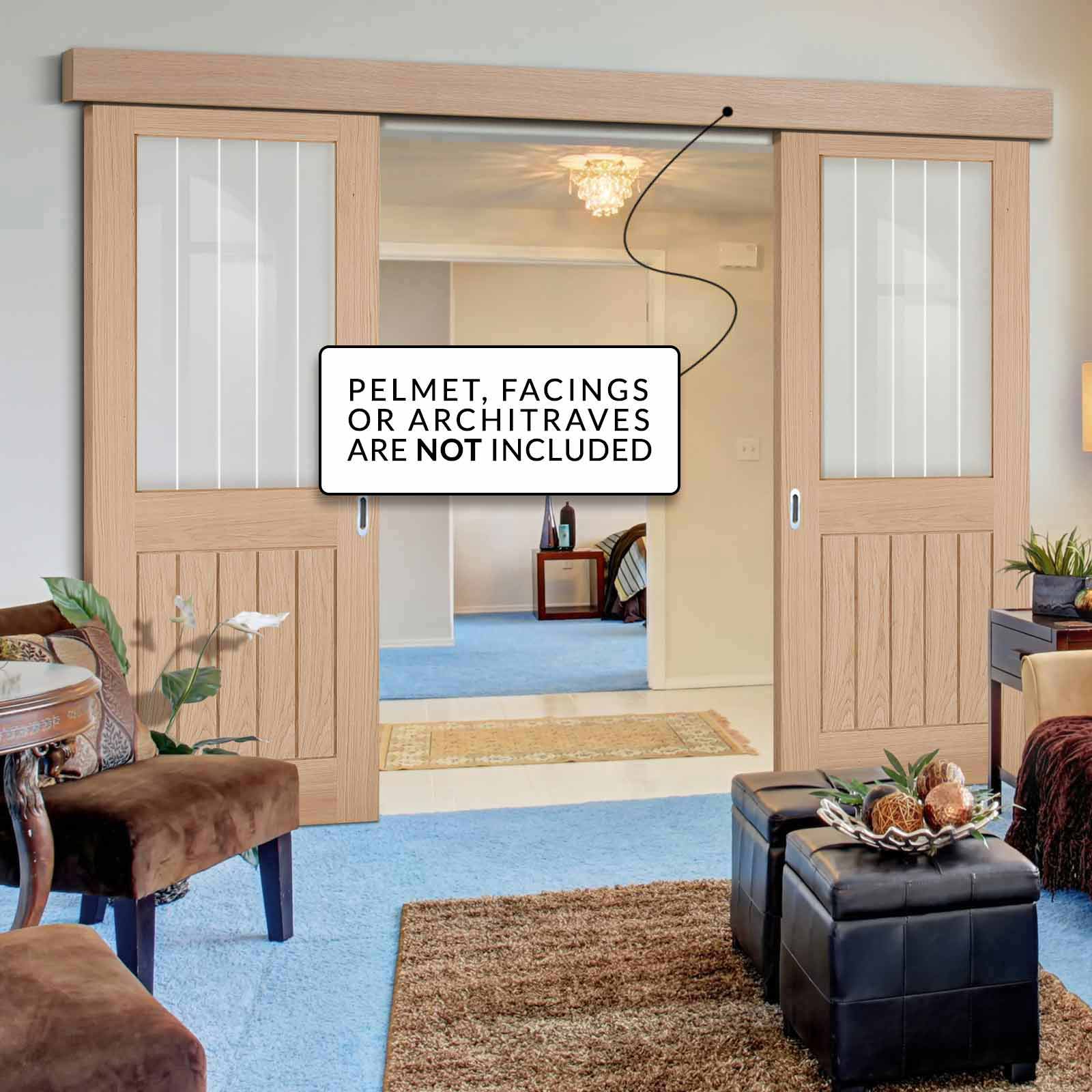 Double Sliding Door & Wall Track - Belize Oak Doors - Silkscreen Etched Clear Glass - Unfinished