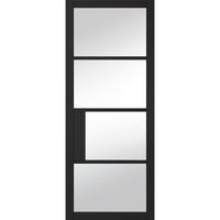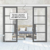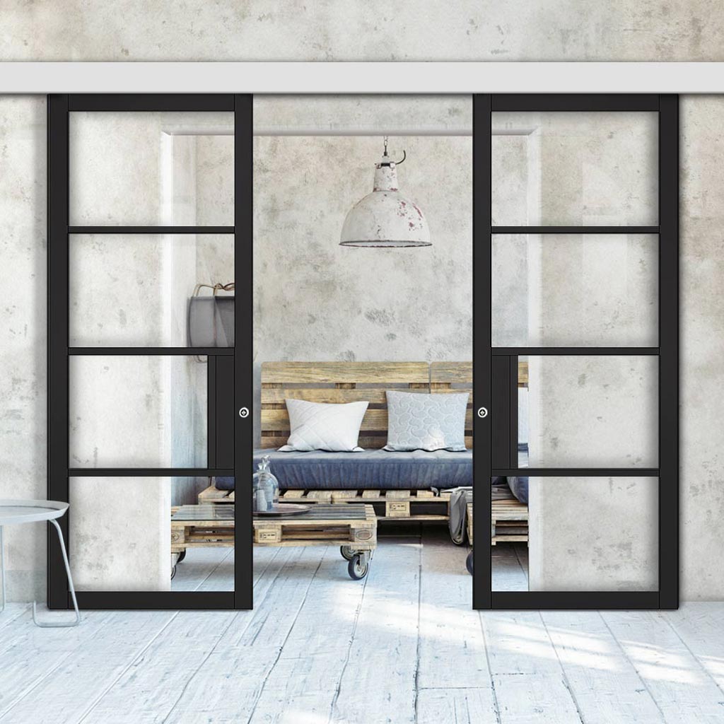Double Sliding Door & Wall Track - Chelsea 4 Pane Black Primed Door - Clear Glass