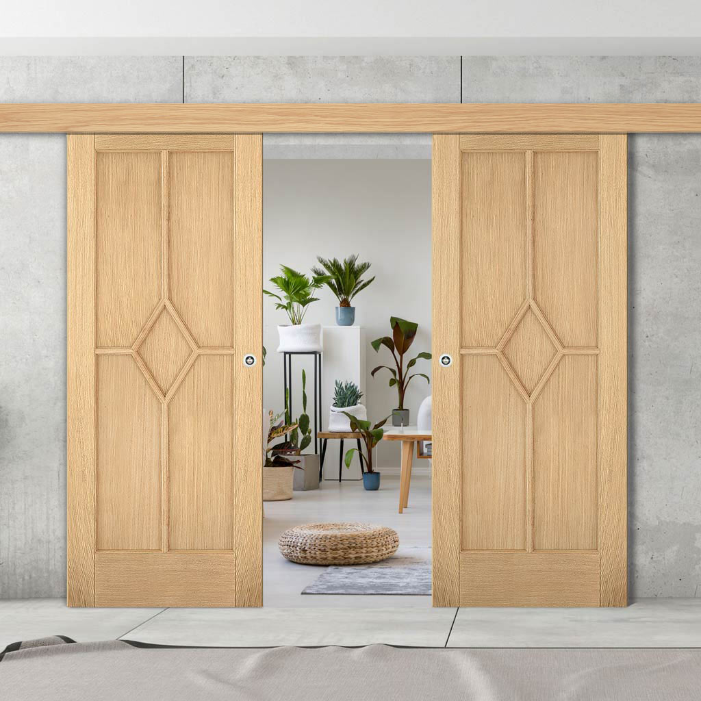 Double Sliding Door & Wall Track - Reims Diamond 5 Panel Oak Door - Prefinished