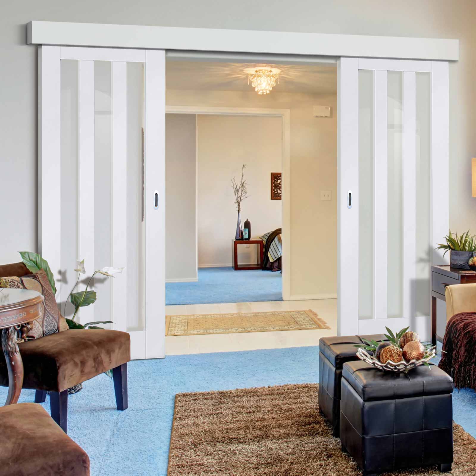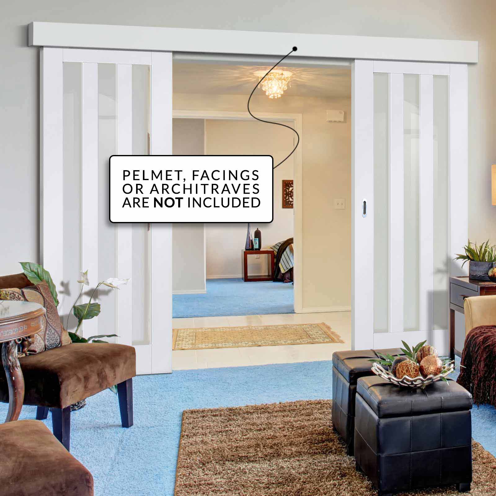 Double Sliding Door & Wall Track - Utah 3 Pane Doors - Clear Glass - White Primed