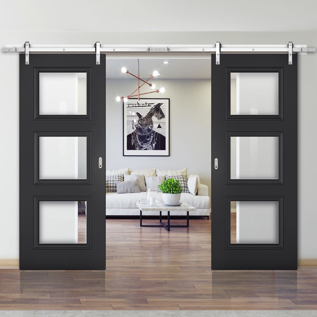 Double Sliding Door & Stainless Steel Barn Track - Antwerp 3 Pane Black Primed Door - Clear Glass