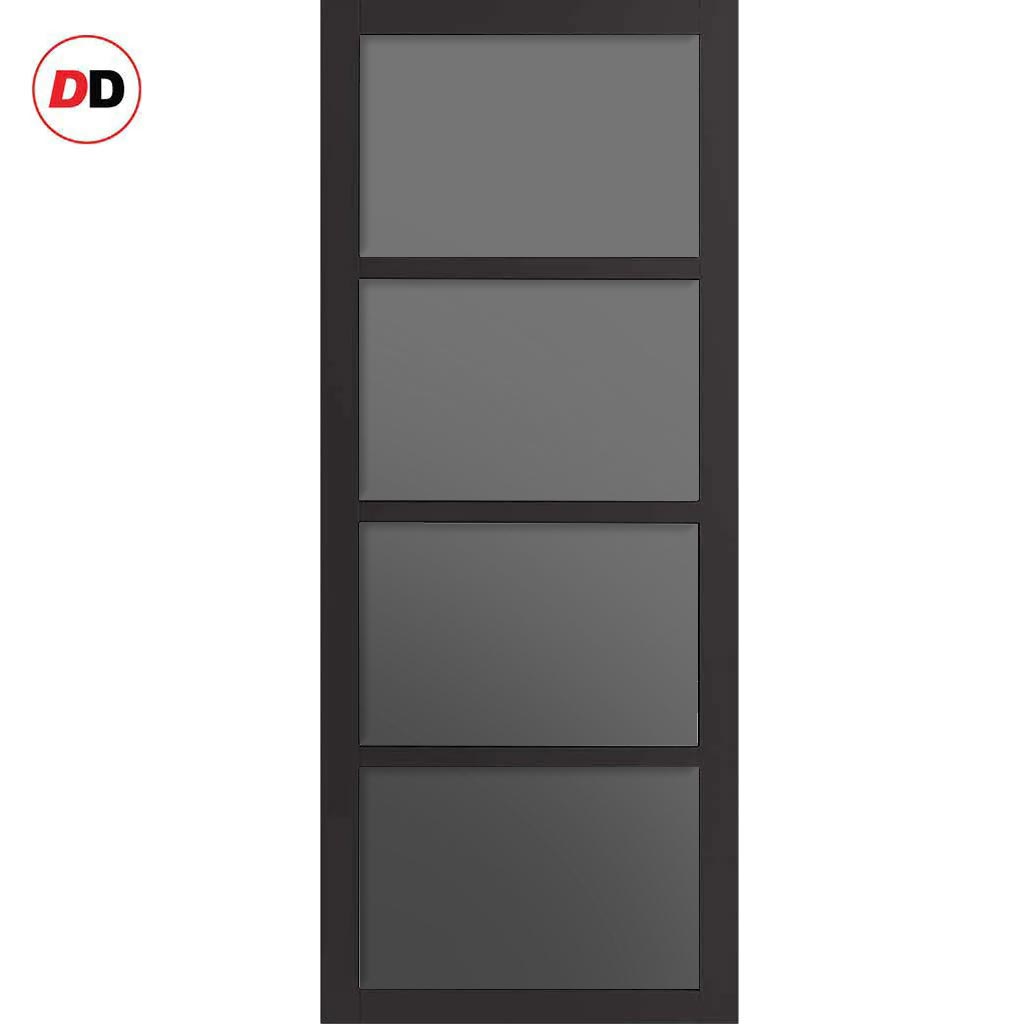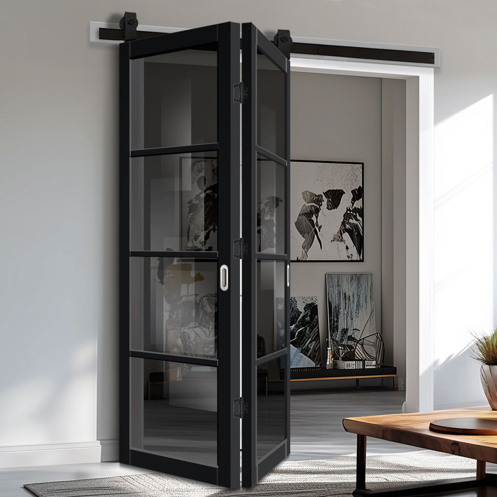 Sliding Top Mounted Black Folding Track & Double Door - Handcrafted Eco-Urban Brooklyn 4 Pane Solid Wood Door DD6308 - Tinted Glass - Premium Primed Colour Options