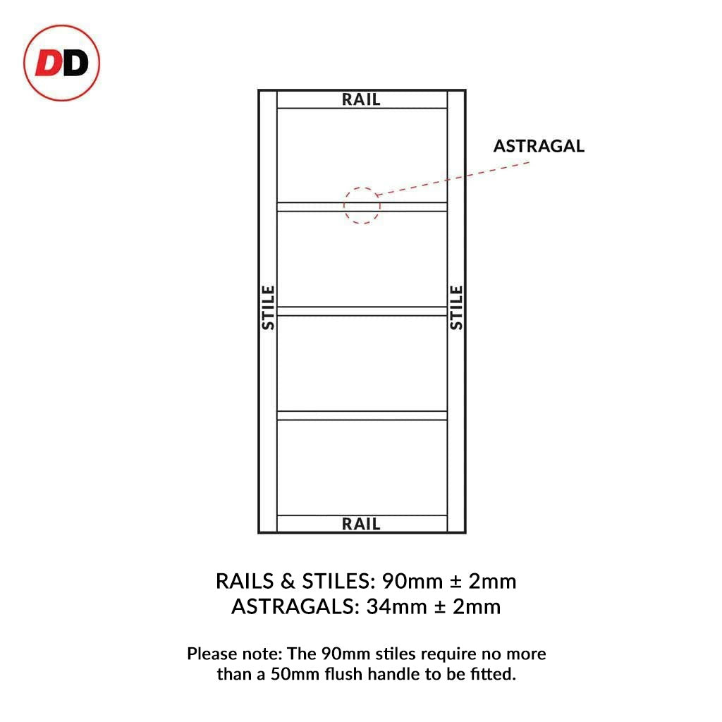 All doors from DirectDoors Bespoke Slimline range are 40mm thick, rail & stile breadths are 90mm, astragals are 34x40mm. All dimensions and thicknesses are +/- 2mm.