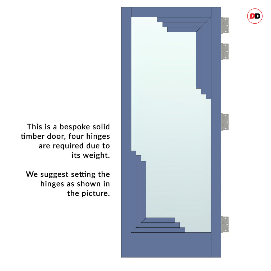 All doors in the DirectDoors Bespoke Urban Deco®range are built to a solid 40-45mm thickness. Top rails and stiles measure 90mm, bottom rail 190mm, with 40mm design feature securely bonded to glass.