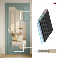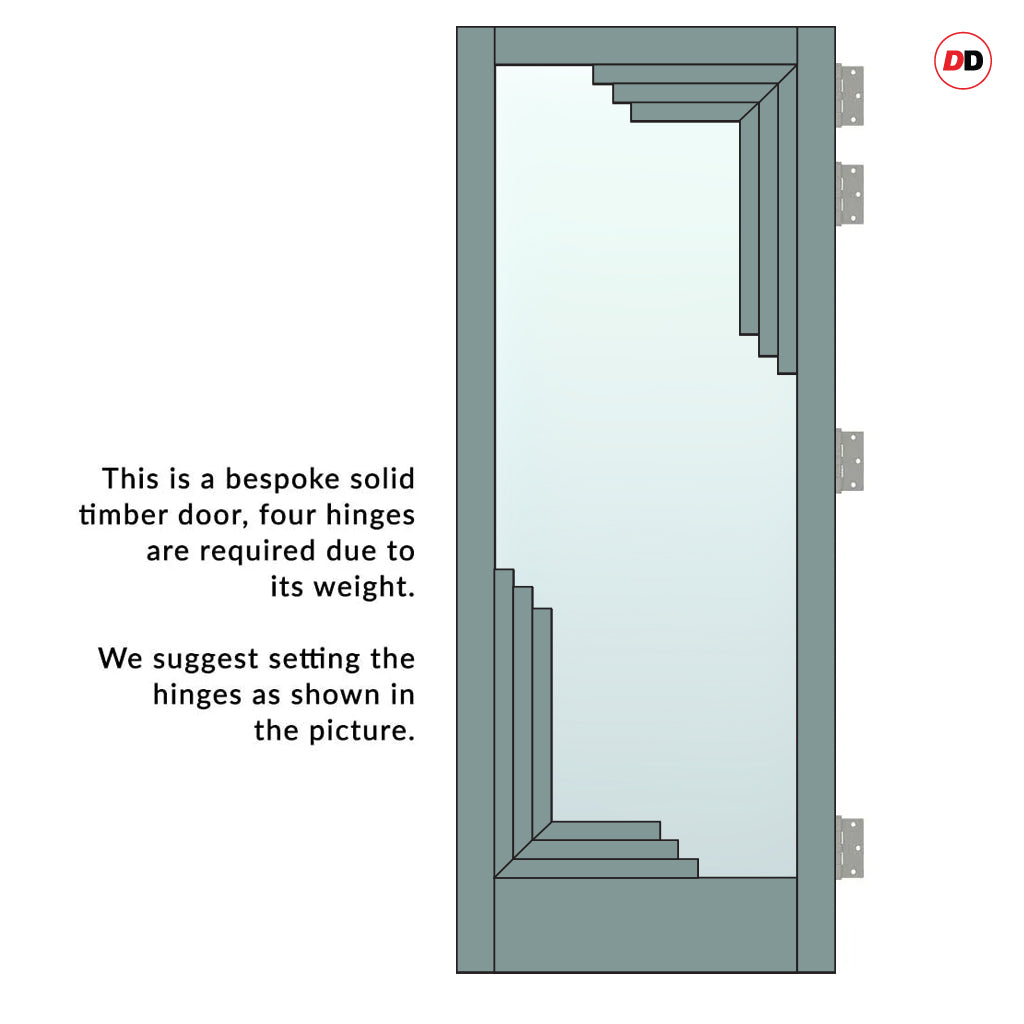 All doors in the DirectDoors Bespoke Urban Deco®range are built to a solid 40-45mm thickness. Top rails and stiles measure 90mm, bottom rail 190mm, with 40mm design feature securely bonded to glass.
