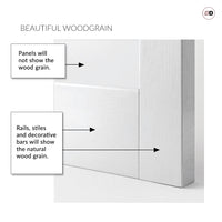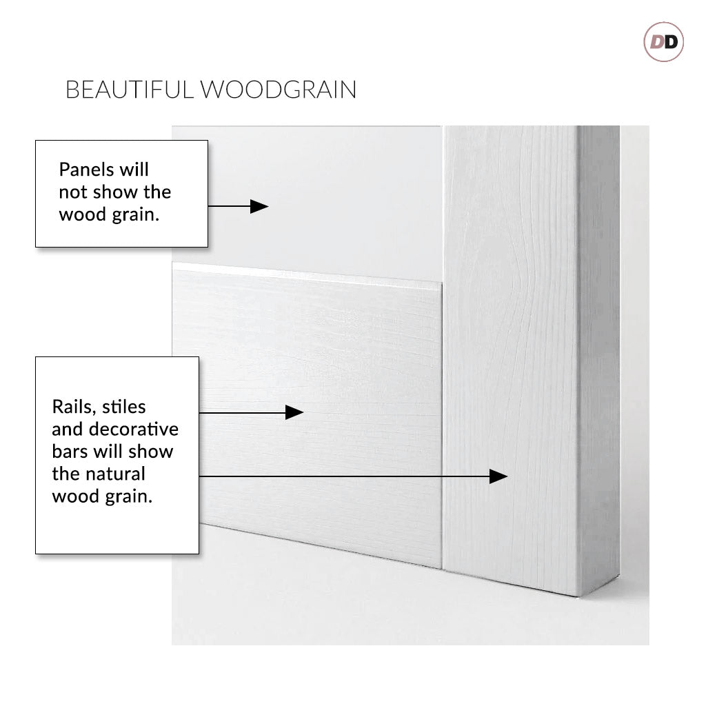 The doors have visible grain. They arrive premium primed. Do not hang as supplied. Add a top coat and reseal all cutouts first.