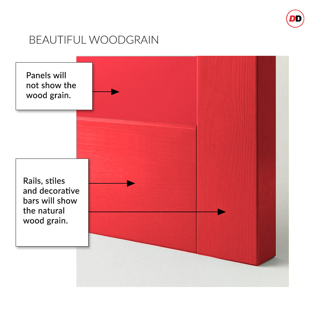 The doors have visible grain. They arrive premium primed. Do not hang as supplied. Add a top coat and reseal all cutouts first.