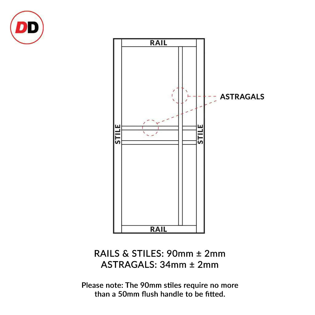 All doors from DirectDoors Bespoke Slimline range are 40mm thick, rail & stile breadths are 90mm, astragals are 34x40mm. All dimensions and thicknesses are +/- 2mm.