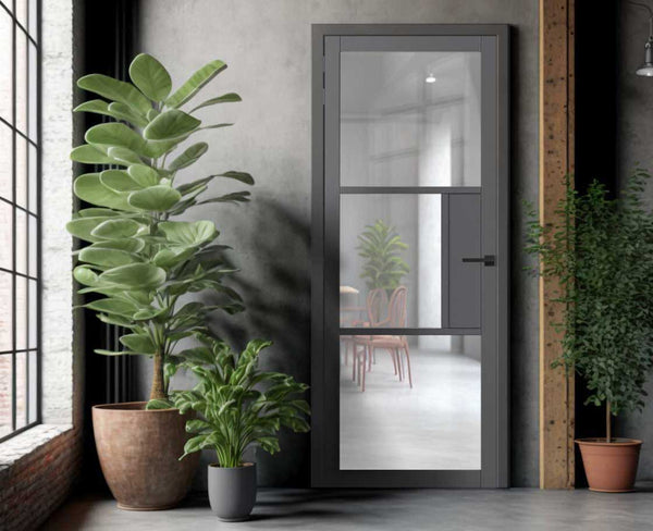 Elevate your living space with our exquisite collection of industrial-style interior doors. With over 40 expertly crafted designs and a curated selection of decor, we make it effortless for you to create a luxurious, upscale ambiance in your home. Discover the perfect balance of modern and industrial aesthetics with our range of panel, clear, frosted, and designer glass doors. Trust us to transform your space into a sophisticated, stylish loft style haven that you'll love coming home to. Choose our industrial-style interior doors and make a statement with your home decor. (Door shown - Cosmo door)