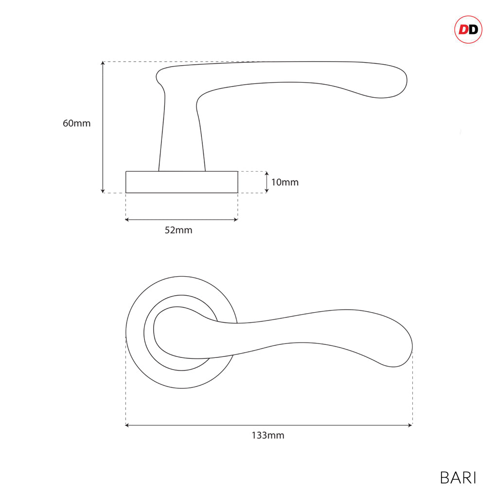 | Handle Size | 52mm Square Rose and 10mm Thick, 133mm Lever. Projects 60mm from door face. |