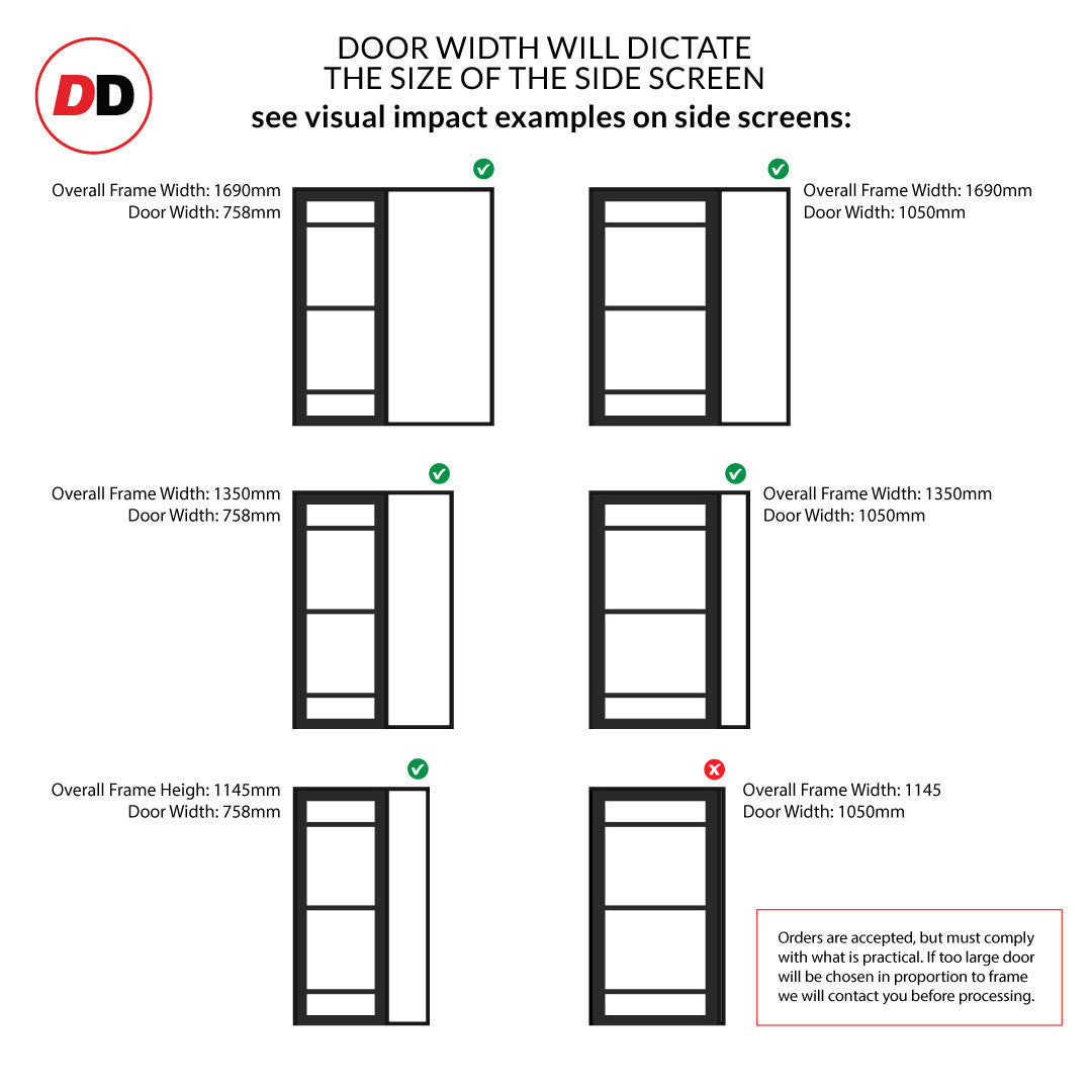 - Aesthetics: Please note any side screens / insets that are narrower than the door or double door will in some instances have smaller or larger glass widths dependent on your choice, please make sure this is fully understood before purchase as these are a bespoke item and cannot be returned.