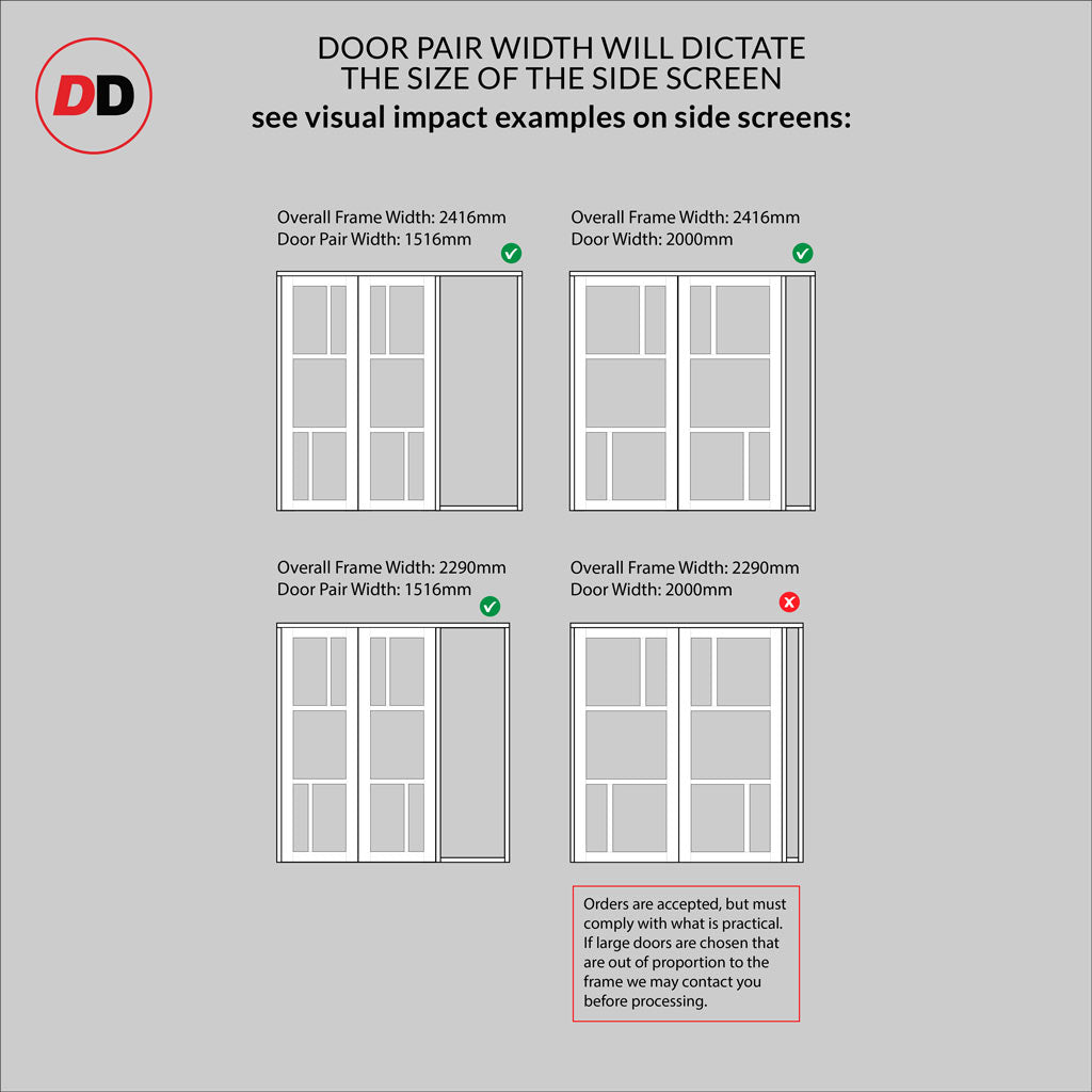 - Aesthetics: Please note any side screens / insets that are narrower than the door or double door will in some instances have smaller or larger glass widths dependent on your choice, please make sure this is fully understood before purchase as these are a bespoke item and cannot be returned.