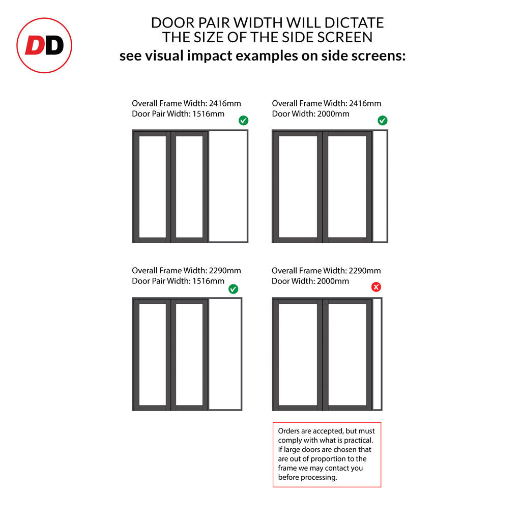 - Aesthetics: Please note any side screens / insets that are narrower than the door or double door will in some instances have smaller or larger glass widths dependent on your choice, please make sure this is fully understood before purchase as these are a bespoke item and cannot be returned.