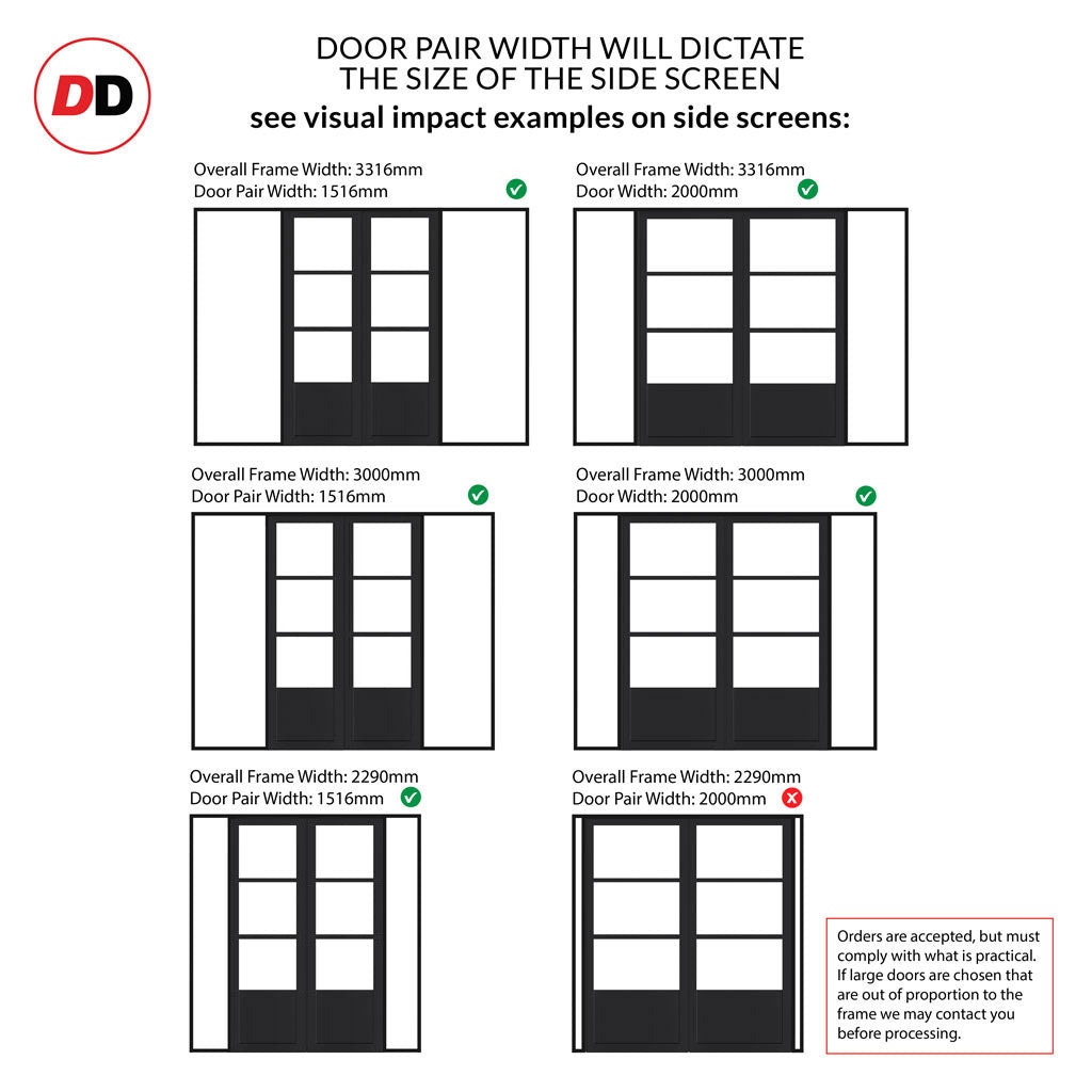 - Aesthetics: Please note any side screens / insets that are narrower than the door or double door will in some instances have smaller or larger glass widths dependent on your choice, please make sure this is fully understood before purchase as these are a bespoke item and cannot be returned.