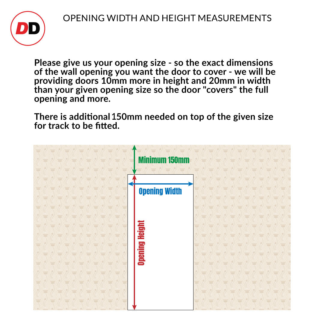 - Please give us your opening size - so the exact dimensions of the wall opening you want the door to cover - we will be providing doors 10mm more in height and 20mm in width than your given opening size so the door "covers" the full opening and more.