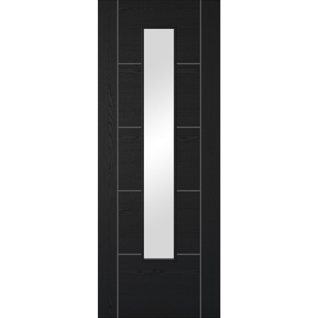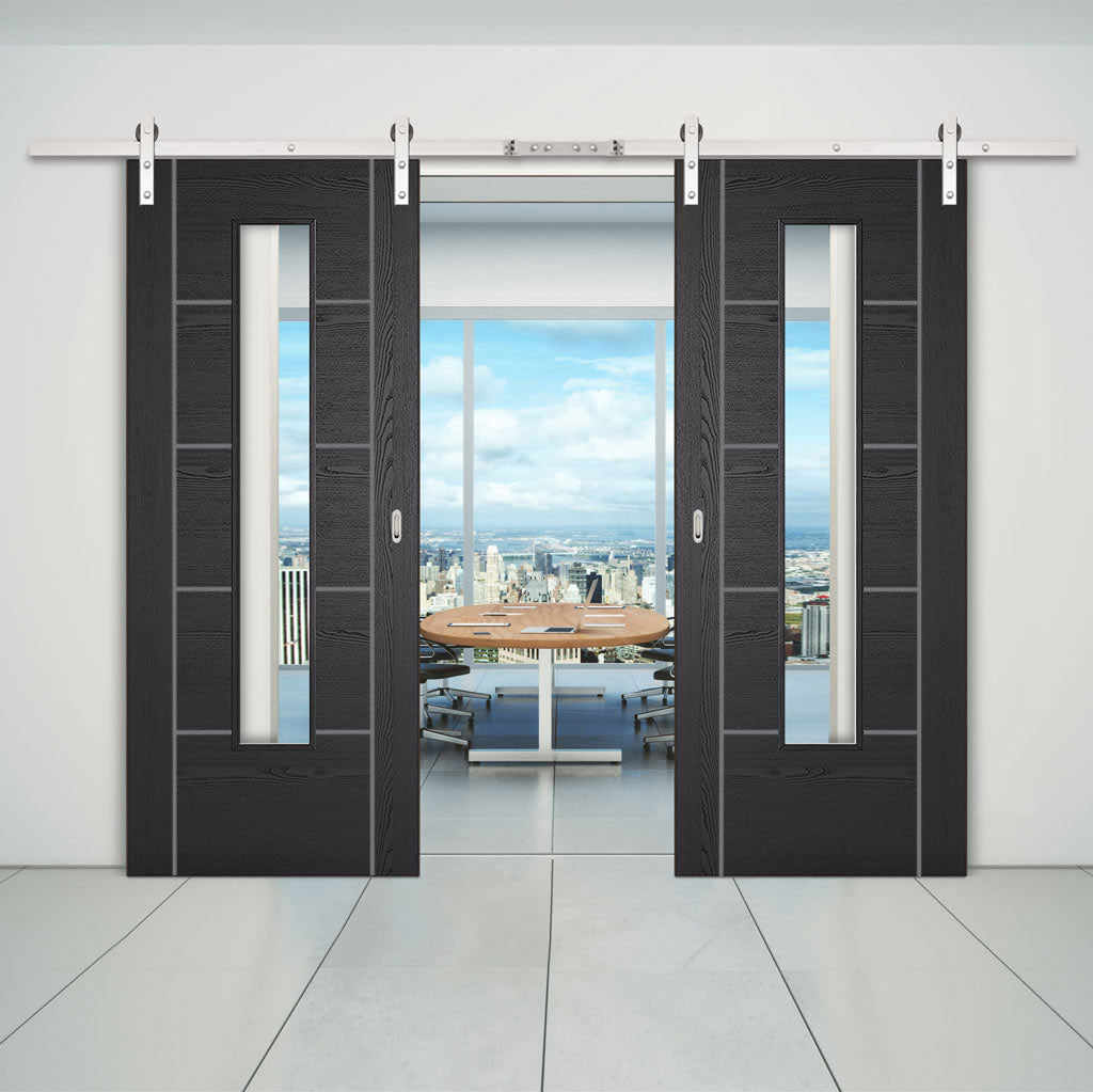 Double Sliding Door & Stainless Steel Barn Track - Laminate Vancouver Black Door - Clear Glass - Prefinished