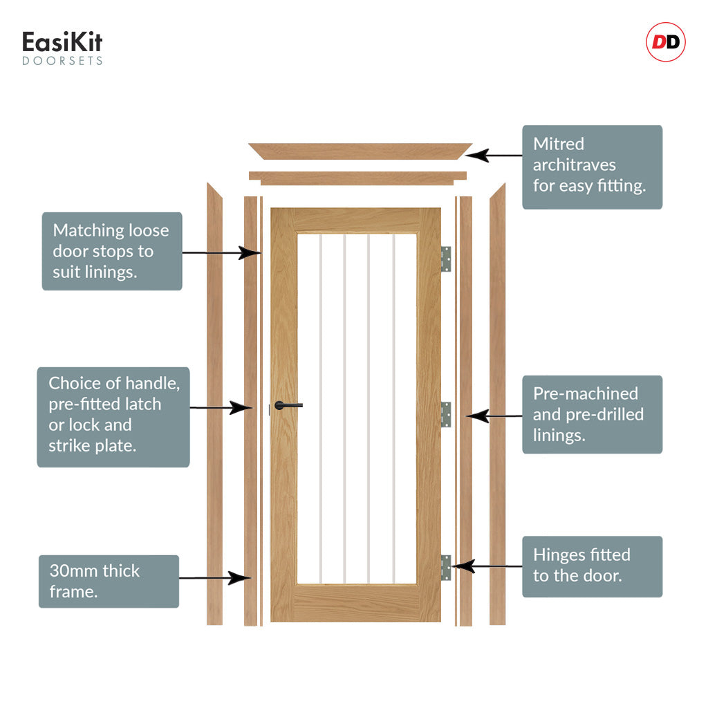 EasiKit Internal Door and Frame Kit - All Fittings Included - Ely 1L Full Pane Oak Internal Door - Clear Etched Glass - Unfinished