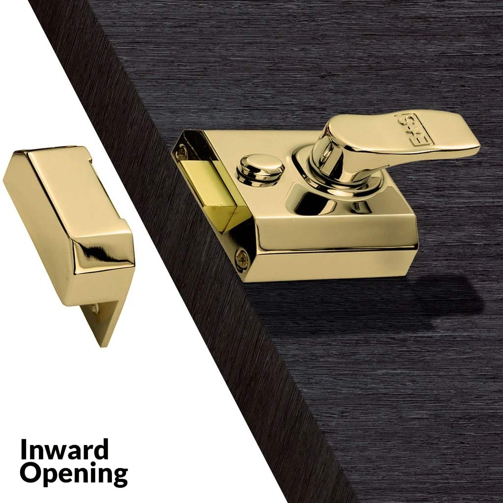This RCN rim night latch door lock is suitable for any 45mm thick timber door that opens inwards and is shown in Polished Brass, available in four finishes, (PC) Polished Chrome, (EB) Polished Brass, Satin Chrome (SC) and also (W) White with a Brass cylinder.