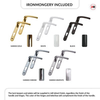 - All sets are inclusive of locks, hinges, handles, letter plate (if chosen), weather bars etc, these are all pre-fitted and ready for installation but some items will be removed to allow for safe transportation and ready for you to easily assemble on site.