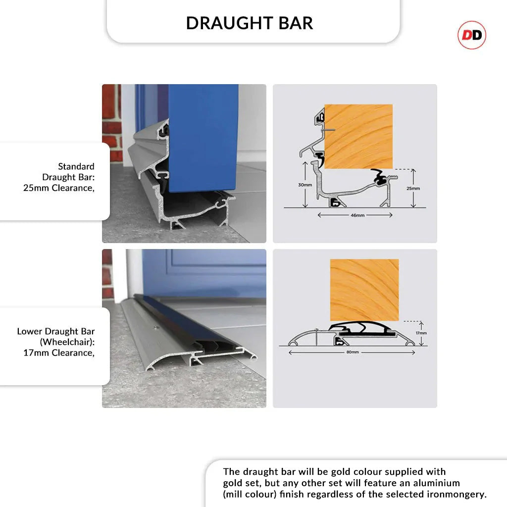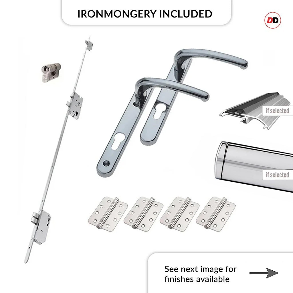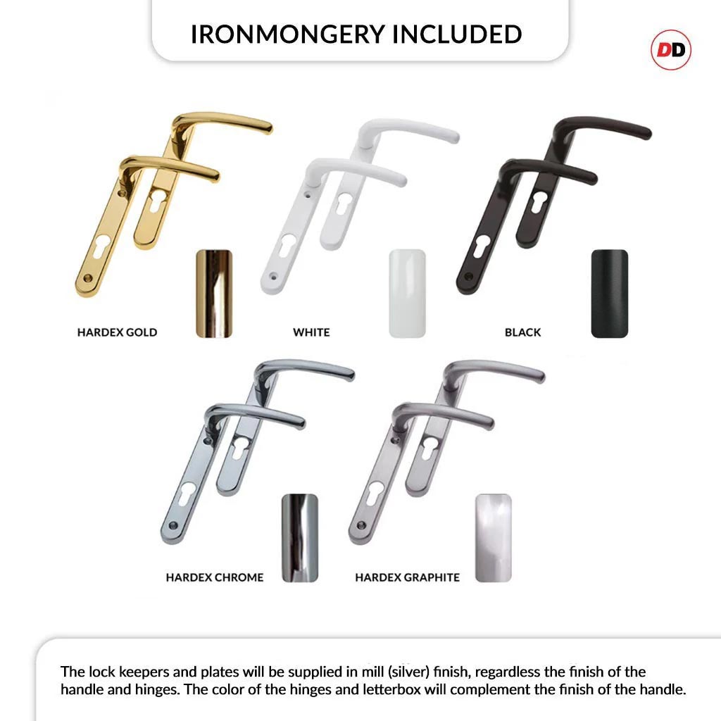 - All sets are inclusive of locks, hinges, handles, letter plate (if chosen), weather bars etc, these are all pre-fitted and ready for installation but some items will be removed to allow for safe transportation and ready for you to easily assemble on site.